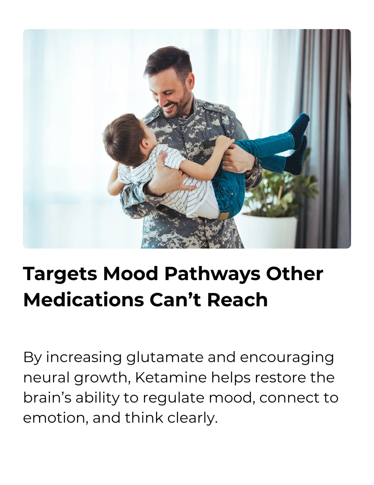Instead of targeting serotonin like traditional antidepressants, ketamine works on the glutamate system, helping the brain rebuild damaged neural pathways and restore healthier emotional functioning. Many patients describe feeling lighter, clearer, and more hopeful after just a few sessions.