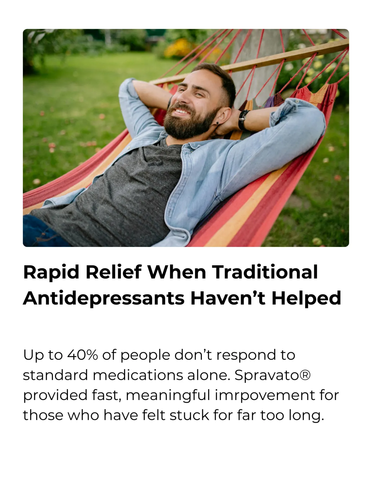 Spravato® is an innovative, FDA-approved treatment designed specifically for individuals living with major depressive disorder (MDD) and treatment-resistant depression (TRD). For people who have tried multiple antidepressants without feeling better, Spravato® offers a new path forward — with relief that can begin within hours instead of weeks.