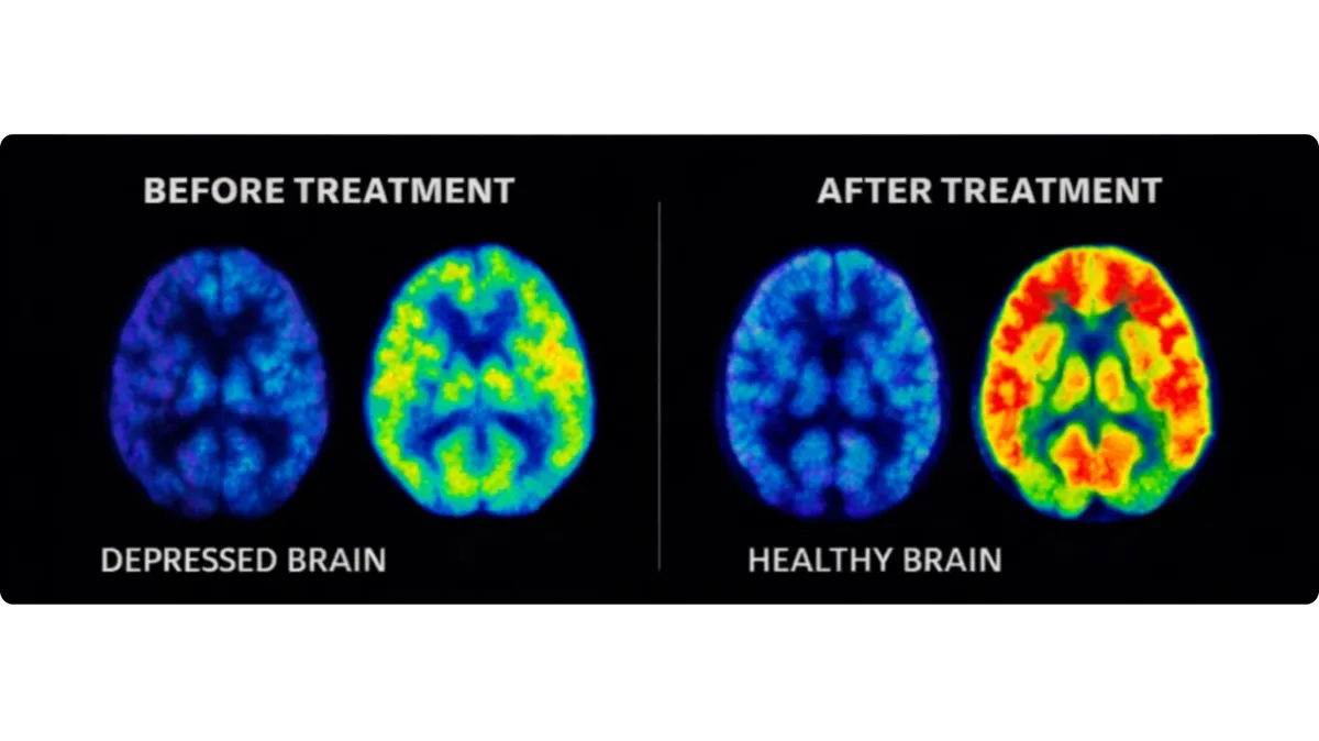 This PET scan shows brain activity using color, where blue and purple represent low energy and yellow and red represent high energy. It illustrates how a "depressed" brain is physically less active—essentially dimmed down—while a "healthy" brain is vibrant and fully engaged. The comparison highlights that depression is a biological state, but one that can be "recharged" and restored through treatment.
